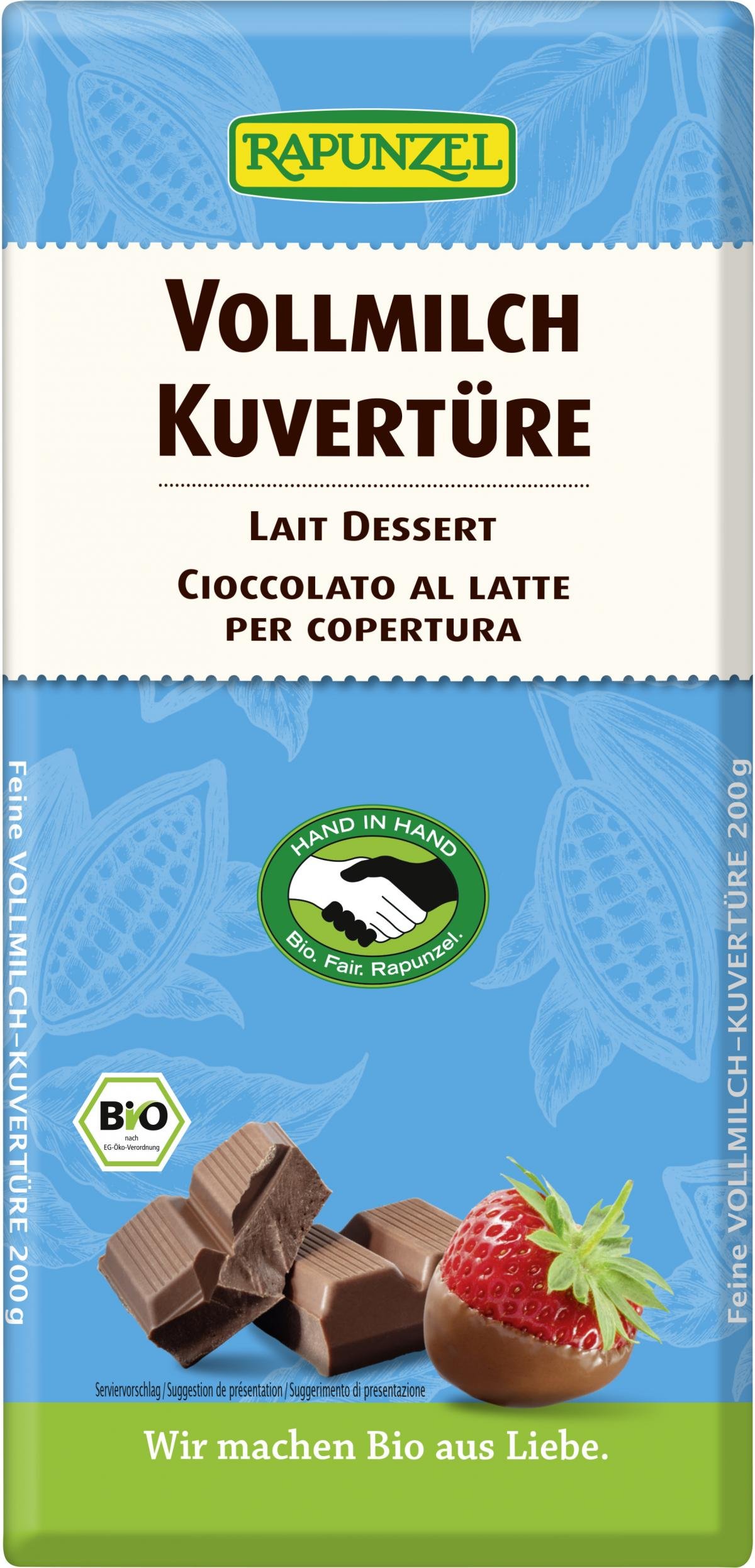 Was wären zarte Pralinen, süße Früchte oder feines Gebäck ohne diesen schmelzenden Überzug aus glänzender Schokolade? Wunderbar aromatischer Kakao und Vollmilch mit einem hauch Bourbon Vanille verfeinert Ihre Kuchen, Gebäcke und Pralinen. Die Kuvertüre wird aus fair gehandeltem Kakao und Zucker hergestellt und ist ein Produkt des Rapunzel HAND IN HAND-Sortiments.