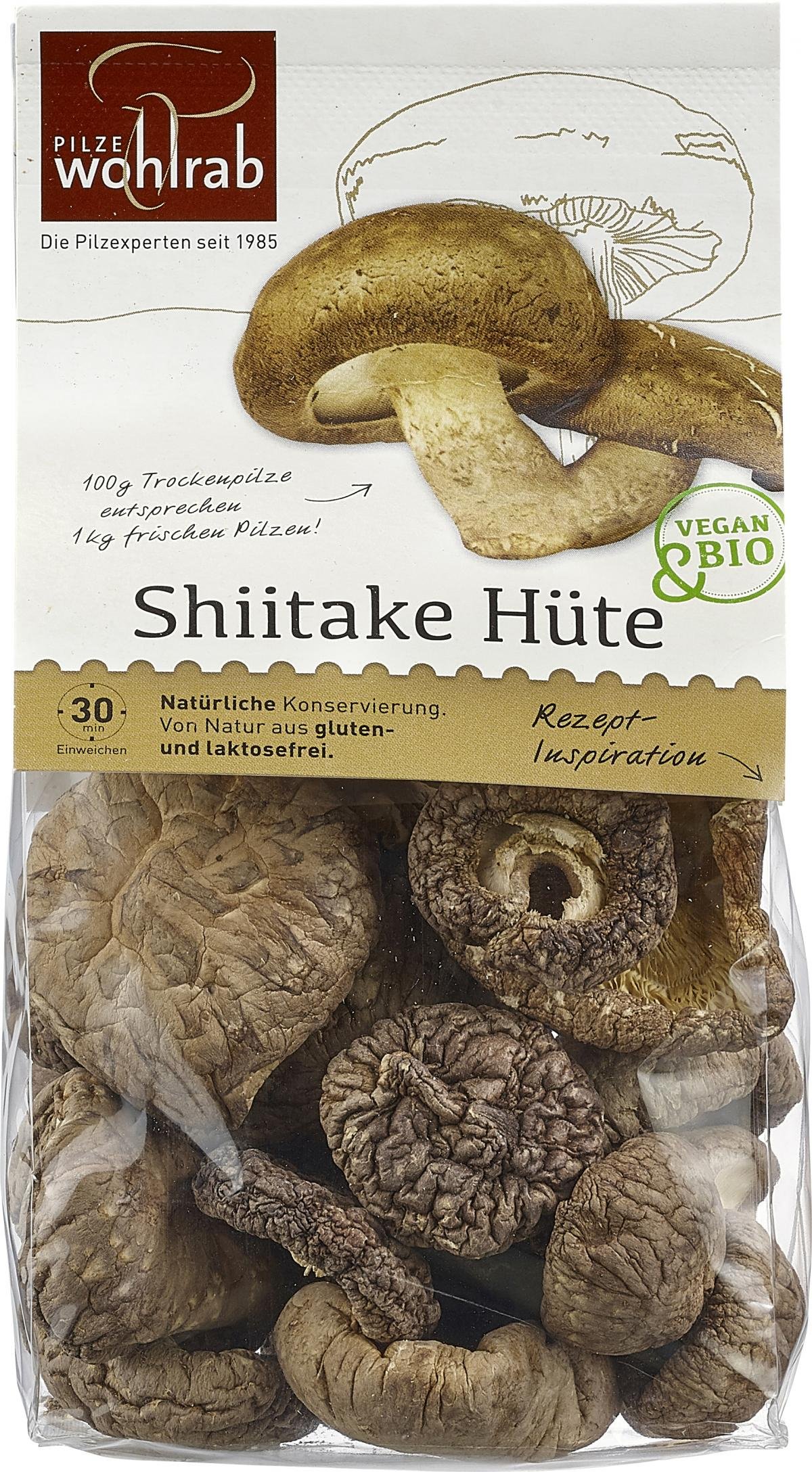 Der Shiitake riecht knoblauchartig und eignet sich ganz besonders zum Trocknen: sein würziger Geschmack wird beim Trocknen deutlich intensiver. Er ist ernährungsphysiologisch ein sehr wertvoller Pilz und enthält Ballaststoffe, Proteine, die Vitamine B, C und die Vitamin-D-Vorstufe Ergosterol sowie die Mineralien Eisen, Kalium und Zink. Der Shiitake wird häufig auch als „König der Heilpilze“ bezeichnet. Er passt hervorragend zu zahlreichen Gerichten – ein Vorrat an getrockneten Shiitake sollte deshalb in keiner Küche fehlen.